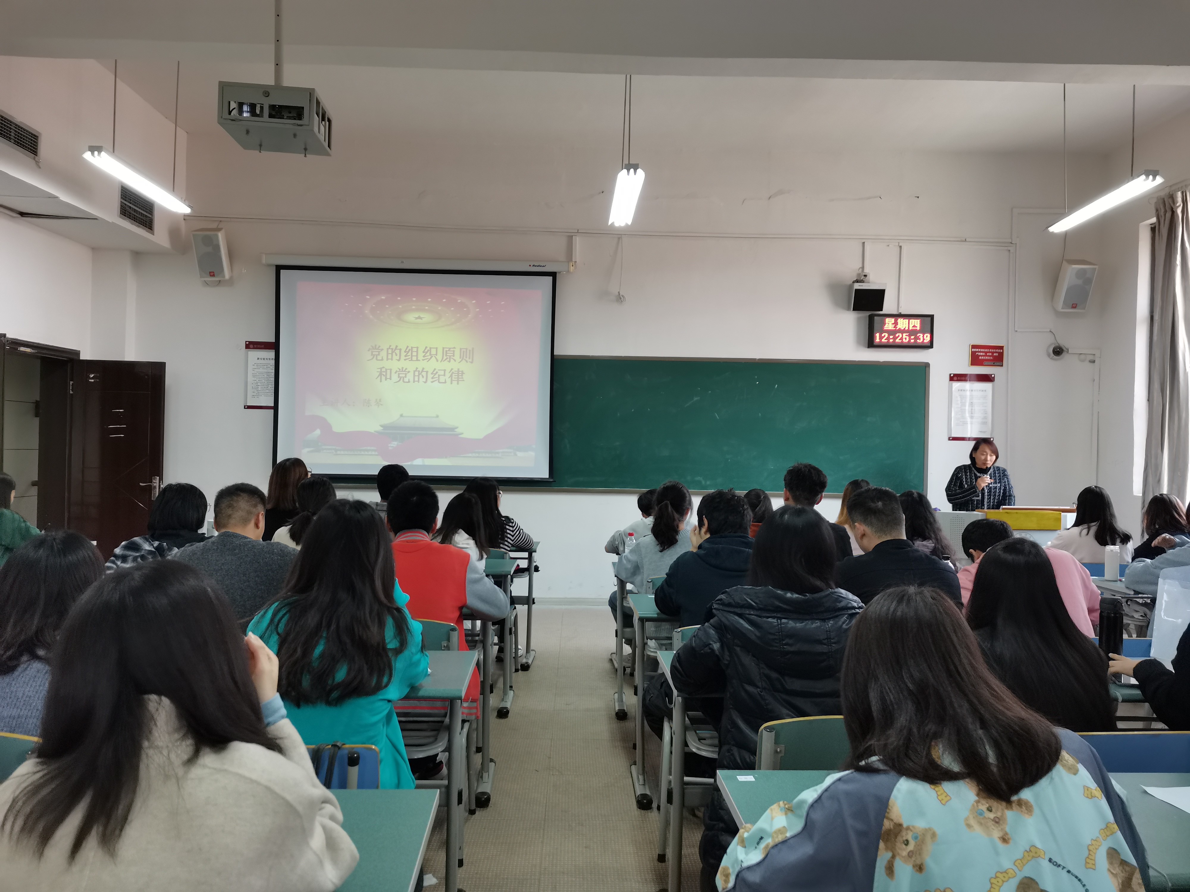 11月19日中午,信息公司党委纪检委员陈琴在志学楼414为3044永利集团有限公司入党积极分子培训班的学员们上党课,陈琴以“党的组织原则和党的纪律”为题作了精彩讲授。