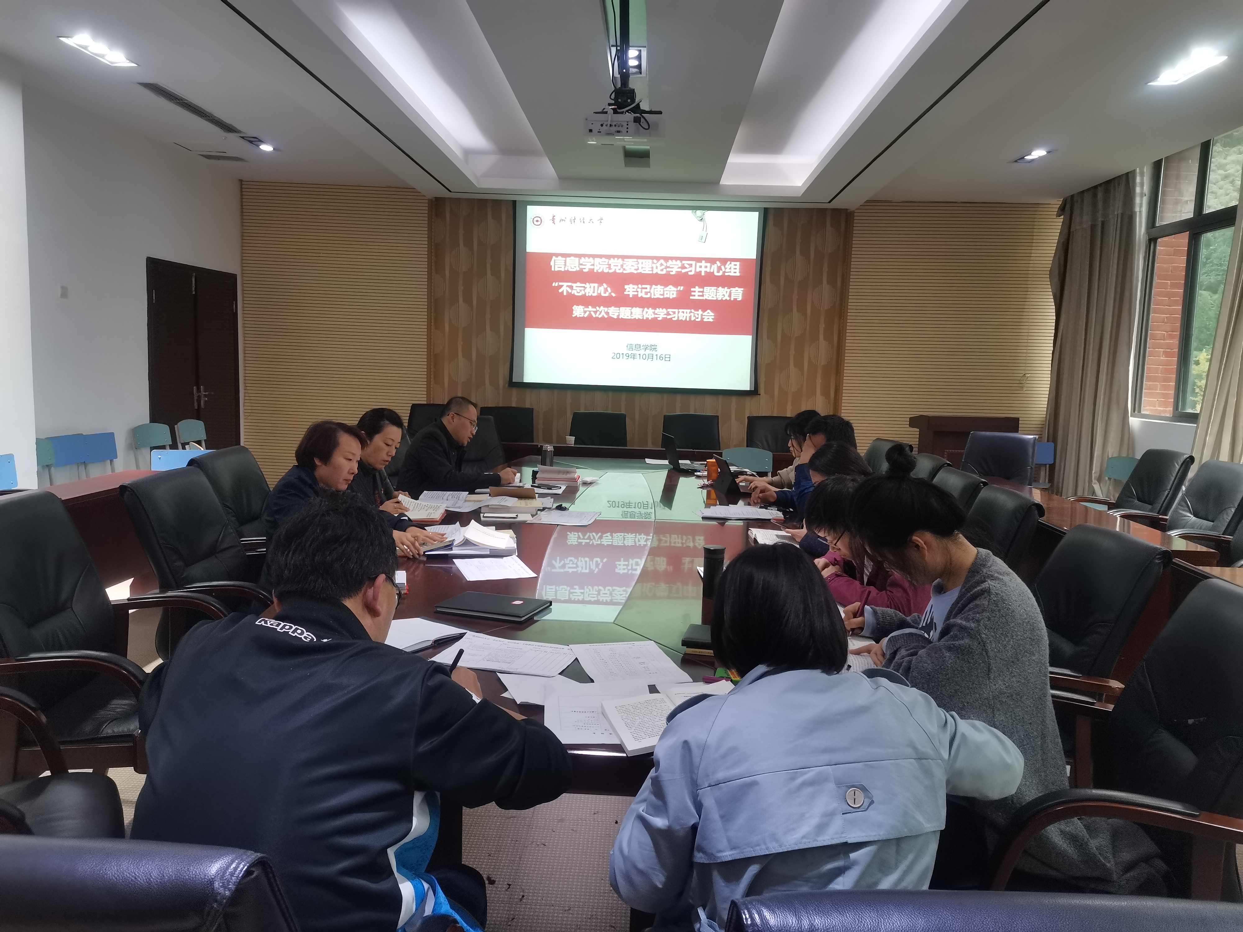 信息公司党委理论学习中心组于10月16日下午4点半在志学楼427会议室理论学习中心组召开“不忘初心、牢记使命”主题教育第六次专题集体学习研讨会,公司领导、各系(科室)负责人、党支部书记参会,卿春主持会议。