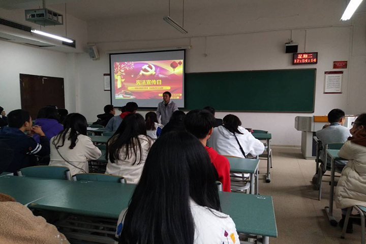 王游滨发言,首先他介绍了宪法宣传日的由来和举办此次主题活动的意义,然后提出了三点要求:一是广大同学要充分认识国家设立宪法宣传日的意义,二是要求大家做个学法懂法的人,三是希望大家积极主动参与此次主题活动。