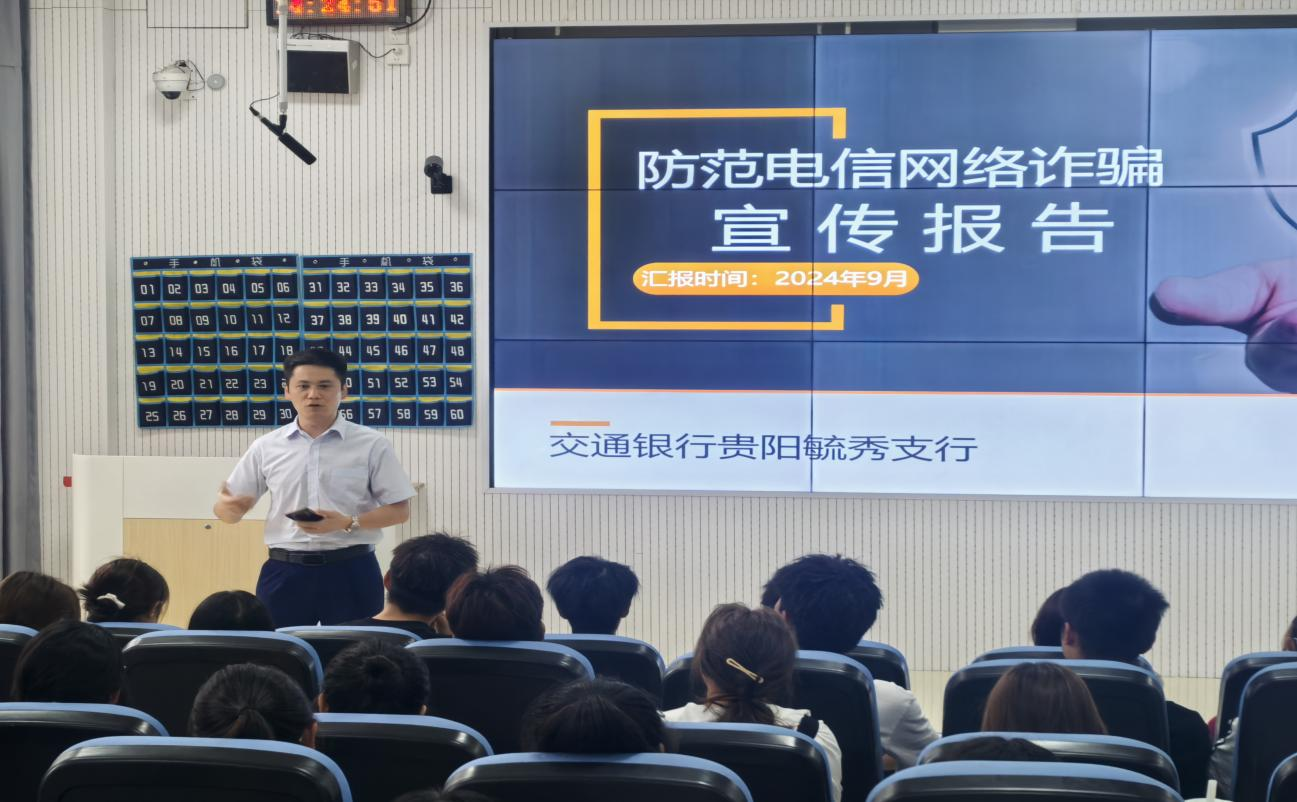 本网讯:(秦敏 图文报道)为进一步提升老员工防范电信网络诈骗的自我保护能力,2024年9月18日下午,3044永利集团有限公司邀请2008级信息管理与信息系统专业员工、交通银行贵阳毓秀支行行长彭健开展专题宣讲,活动在进学楼103举行,2024级新生120人参加了此次宣讲活动。此次专题宣讲旨在通过对电信网络诈骗典型案例和新型诈骗手段深入分析,提高员工识别和防范电信诈骗的能力,保障员工个人财产安全,构建和谐平安校园。