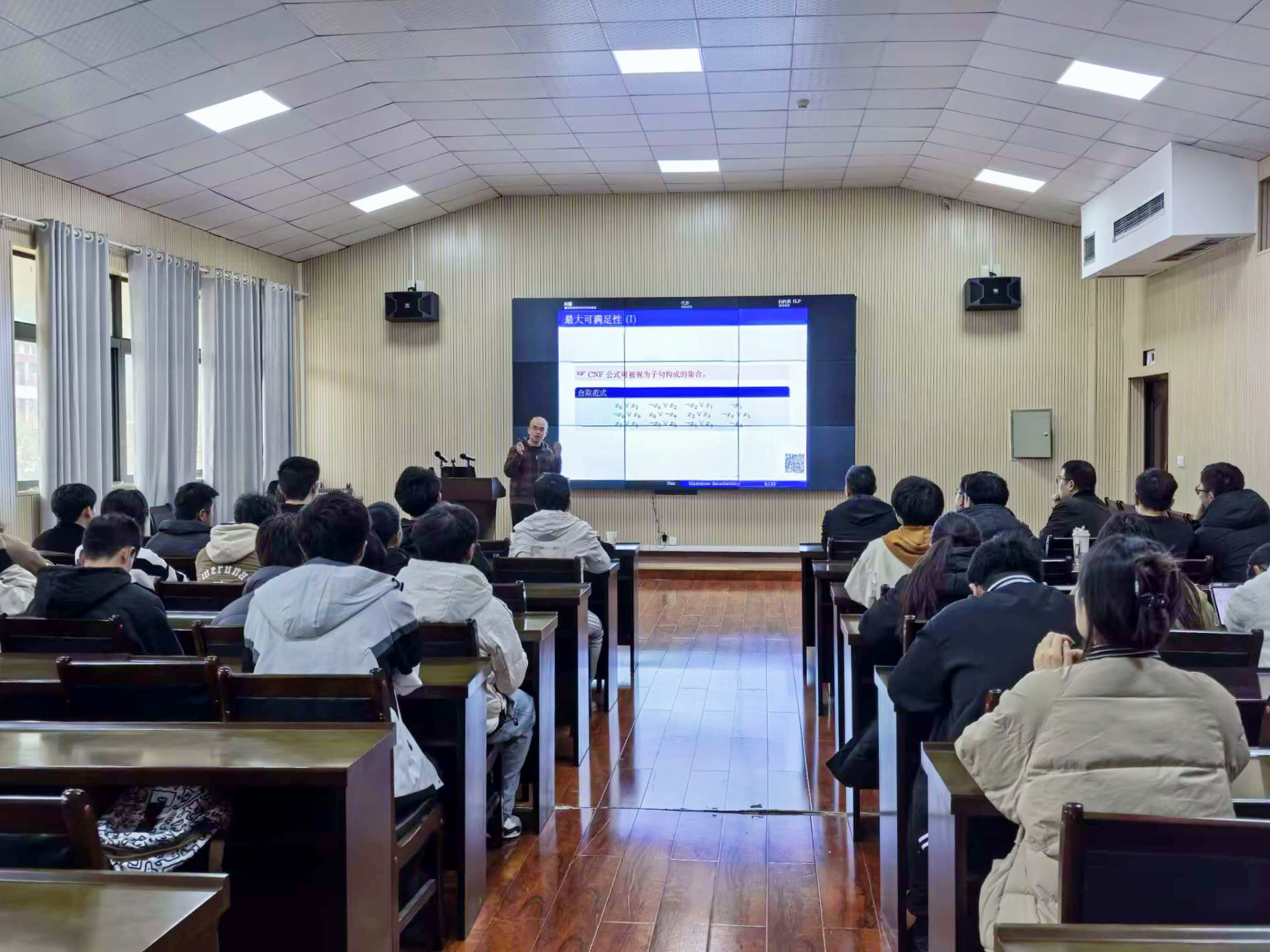范懿副教授以“MaxSAT问题”为题,深入探讨了这一重要的组合优化问题。他指出,MaxSAT问题作为SAT(可满足性问题)的扩展形式,主要分为带权重的MaxSAT问题和部分MaxSAT问题。其中,带权重的MaxSAT问题旨在寻找一个解,以得到更大的权值;部分MaxSAT问题旨在寻找一个解,以满足所有的硬子句和尽可能多的软子句。范懿副教授还介绍了这两类MaxSAT问题的实际应用场景及其相关规律。他的讲解深具理论深度,又紧密联系实际,激发了在场师生的浓厚兴趣。