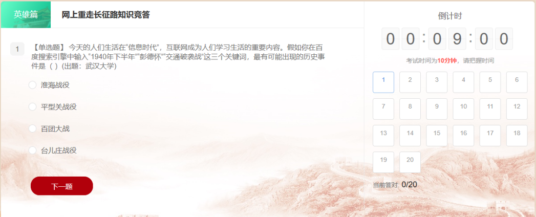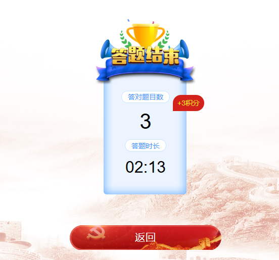 每日答题:选择英雄篇、复兴篇、创新篇、信念篇答题,系统按内容随机出20道题,限时10分钟,每题1分,根据选手答对的题数进行积分,分数计入个人积分和公司积分中。