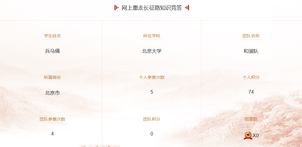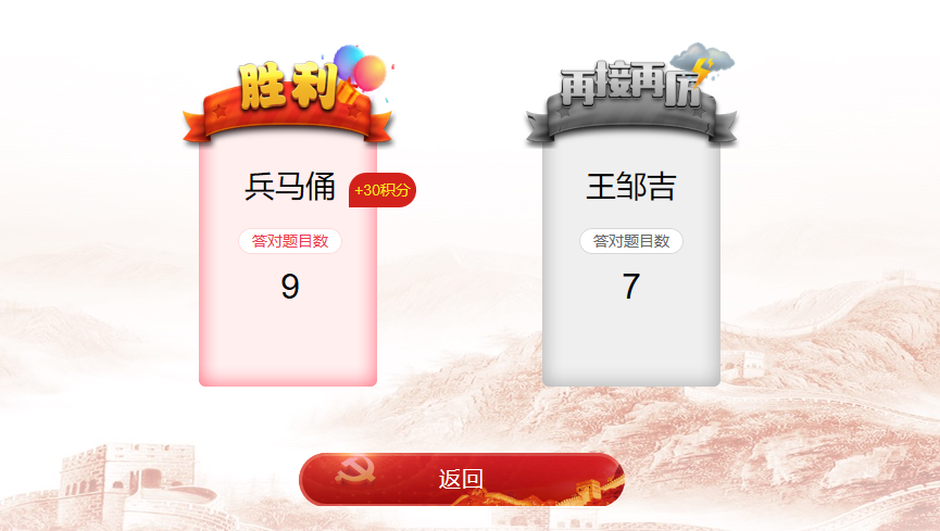 2.PK模式:选手选择限时赛或抢十赛后,由系统随机匹配对应省份参与PK模式答题的对手。限时赛为双方在3分钟内,答题数量多者胜,最多30题。抢十赛为双方在3分钟内,先答对10题为胜。PK胜利获得30积分,计入个人积分和高校积分中。