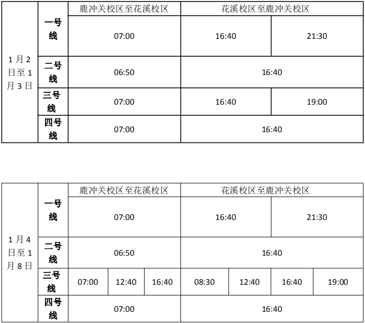 按照集团统一安排,公司鹿冲关校区、花溪校区进入期末考试阶段, 1月8日考试结束,为满足期末考试需要和行政科研工作的开展,现对交通车作如下调整: